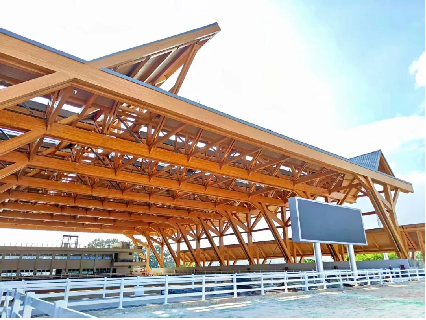 馬術場館屋頂由73000余個、直徑20毫米的膠合木螺栓鎖住。單榀(雙拼)木梁最大長度達96米,木梁跨度66米,最大懸挑20米,系國內最大跨度的木結構體育建筑。 項目時間緊、工藝復雜,項目團隊勠力同心、攻堅克難,科學擬定項目計劃,合力安排專業工序,統籌調配資源要素,積極配合現場施工,為項目如期交付奠定堅實基礎。