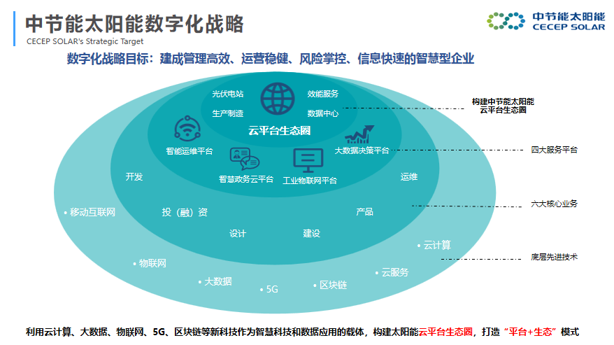 中節能太陽能以智能制造信息化為基礎,規劃構建了“云平臺生態圈”,提供行業級“產品+服務”,實現對內與對外的數字化應用服務與轉型輸出,從而更好地提供集“硬+軟+云+集成+咨詢”于一體的智能制造全場景解決方案。