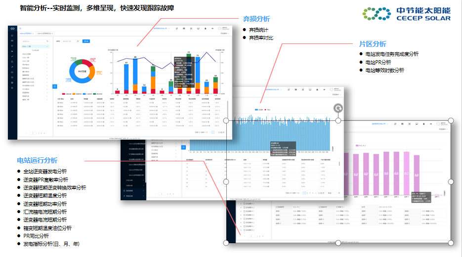 “節能云平臺”讓生產管理、電站運維、安全保障和投資分析變得簡單方便,讓電站更加智慧、友好。依托“工業互聯網平臺”構建中節能智能制造體系,持續踐行光伏制造智能化應用。實現無紙化生產,產能提升50.7%、效率提高15%;271臺設備聯網,數據采集22080個,10305萬條數據聯網、關鍵裝備互聯100%。依托“智能運維平臺”構建中節能智慧運維體系,開拓能源互聯網模式。平臺規劃226項系統功能、161項分析模型、89個KPI指標;已接入376臺主設備、6675數據采集點、9555萬條數據聯網,實現若干個相鄰電站集中調度,實時監測每個電站的運營情況,減輕一線運維人員勞動量,電站運維效率提升50%、日發電量提升約6%。