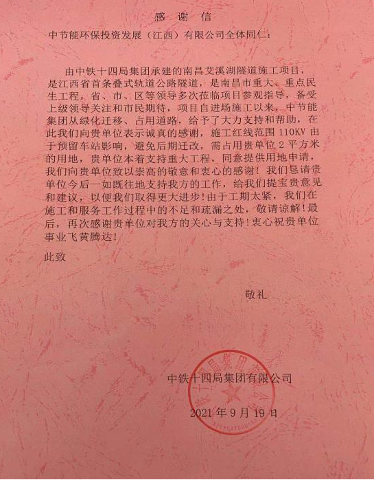 南昌市艾溪湖隧道項目為南昌市重大重點工程,項目正處于緊張的施工階段,由于項目工期緊任務(wù)重,2022年春節(jié)前必須通車,中鐵十四局集團有限公司根據(jù)現(xiàn)場情況對規(guī)劃進行臨時調(diào)整,需占用中節(jié)能國際中心項目部分紅線內(nèi)用地。江西公司為支持南昌市軌道交通事業(yè)發(fā)展,也為了踐行央企社會責任,第一時間增加總經(jīng)理辦公會議題,并審議通過了占地申請,以實際行動支持該重大重點民生工程建設(shè)。 錦旗是榮譽,更是責任。江西公司將繼續(xù)秉承國有企業(yè)的初心和使命,勇?lián)肫笊鐣熑危瑸橹频胤秸G色發(fā)展,打造美麗中國“江西樣板”貢獻央企力量。