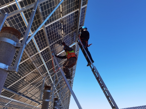 太陽能華北區(qū)通榆電站自入秋以來,突如其來的三場臺風給設備安全穩(wěn)定運行帶來嚴峻考驗。廠區(qū)積水嚴重,多處道路變成深水區(qū),給設備安全穩(wěn)定運行帶來極大隱患,且地面積水無法架設絕緣梯,給運維人員檢修發(fā)電設備制造了嚴重障礙,檢修設備難度大大增加,但電站運維人員不等不靠,紛紛化身“智多星”,群策群力,出謀劃策,最后決定在絕緣梯頂端加裝掛鉤,再用頂端的掛鉤懸掛在光伏支架上進行維護,解決運維難題。 埋頭苦干戰(zhàn)嚴寒,提質增效保發(fā)電