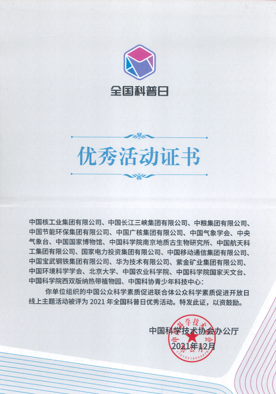 近日,本次科普宣傳活動獲評中國科協“2021年全國科普日優秀活動”。