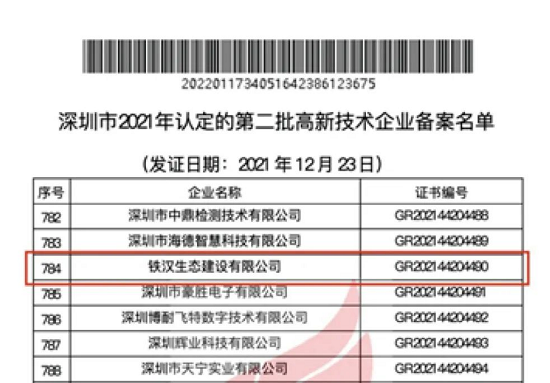 根據《高新技術企業認定管理辦法》(國科發火〔2016〕32號)和《高新技術企業認定管理工作指引》(國科發火〔2016〕195號)文件規定,經審核推薦、前置審查、專家評審、公示、申請備案等程序,全國高企認定辦對深圳市2021年第二批認定的鐵漢生態建設有限公司等企業予以高新技術企業備案。
