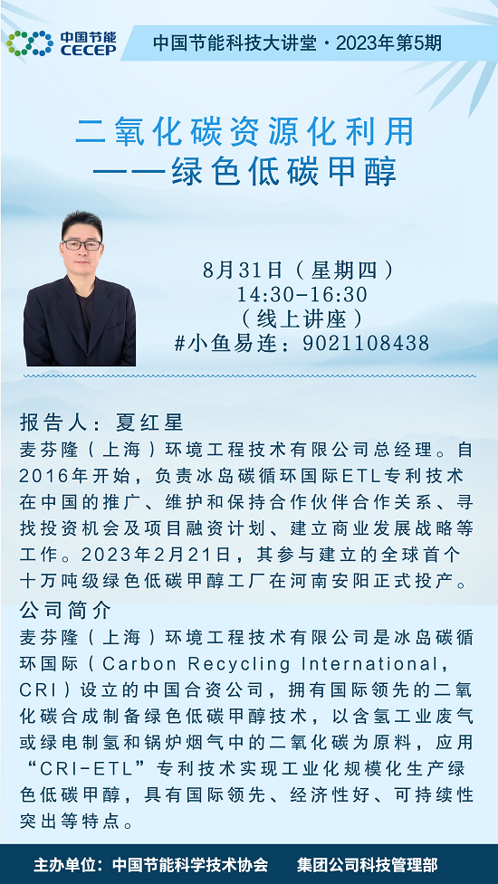 一、講座時間 8月31日(星期四),14:30-16:30 二、講座方式 視頻線上講座。 三、講座內容及專家介紹 講座主題:二氧化碳資源化利用--綠色低碳甲醇 主講人:夏紅星,麥芬隆公司總經理。自2016年開始,負責冰島碳循環國際(Carbon Recycling International,CRI)ETL專利技術在中國的推廣、維護和保持合作伙伴合作關系、尋找投資機會及項目融資計劃、建立商業發展戰略等工作。2023年2月21日,其參與建立的全球首個十萬噸級綠色低碳甲醇工廠在河南安陽正式投產。 麥芬隆公司是CRI設立的中國合資公司,擁有國際領先的二氧化碳合成制備綠色低碳甲醇技術,以含氫工業廢氣或綠電制氫和鍋爐煙氣中的二氧化碳為原料,應用“CRI-ETL”專利技術實現工業化規模化生產綠色低碳甲醇,具有國際領先、經濟性好、可持續性突出等特點。 四、參會人員 視頻會場:各二級子公司、科協成員單位有意參會人員。 小魚易連線上會議號:9021108438。 五、有關要求 請各相關單位將參會人員回執電子版(附件)于8月29日(星期二)下班前反饋至中國節能科協秘書處。 聯系人:吳春廷,010-83052040,13031113033 wuchuntinghao@163.com 附件:參會人員回執 ? ? ? ? ? ? ? ? ? ?中國節能環保集團有限公司 科技管理部? ? ? ? 科學技術協會 2023年8月28日 |
