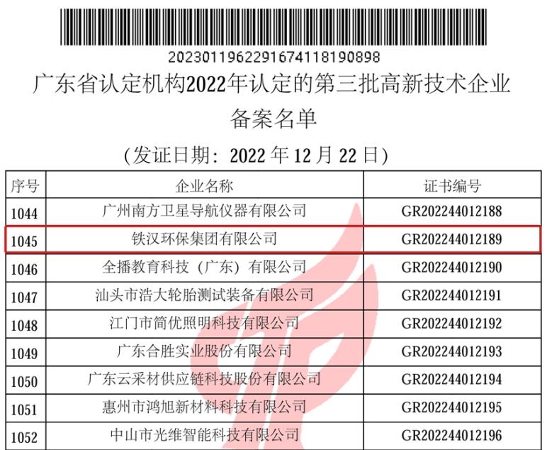 日前,中節(jié)能鐵漢環(huán)保集團(tuán)有限公司(以下簡(jiǎn)稱鐵漢環(huán)保)收到全國(guó)高新技術(shù)企業(yè)認(rèn)定管理工作領(lǐng)導(dǎo)小組辦公室發(fā)布的《關(guān)于對(duì)廣東省認(rèn)定機(jī)構(gòu)2022年認(rèn)定的第三批高新技術(shù)企業(yè)進(jìn)行備案的公告》,根據(jù)《廣東省認(rèn)定機(jī)構(gòu)2022年認(rèn)定的第三批高新技術(shù)企業(yè)備案名單》,鐵漢環(huán)保已通過高新技術(shù)企業(yè)認(rèn)定。這是自2016年起,鐵漢環(huán)保連續(xù)第三次通過國(guó)家高新技術(shù)企業(yè)認(rèn)定。