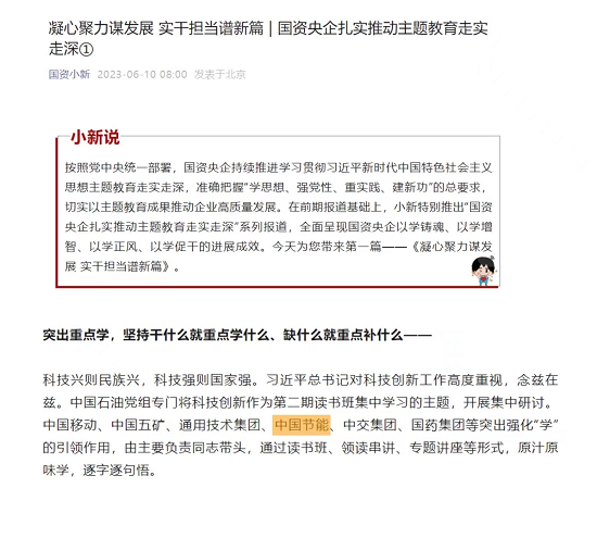 ?近日,中央主題教育官網(wǎng)、國資委網(wǎng)站、“國資小新”新媒體平臺、國資委主題教育簡報(bào)多篇次、高頻次報(bào)道中國節(jié)能開展主題教育的特色亮點(diǎn)和經(jīng)驗(yàn)做法,《習(xí)近平經(jīng)濟(jì)思想研究》期刊特別刊發(fā)中國節(jié)能黨委書記、董事長宋鑫有關(guān)充分發(fā)揮主題教育牽引力作用,推動長江經(jīng)濟(jì)帶高質(zhì)量發(fā)展的署名文章,對中國節(jié)能扎實(shí)推動主題教育走深走實(shí)的具體實(shí)踐給予高度評價(jià)。
