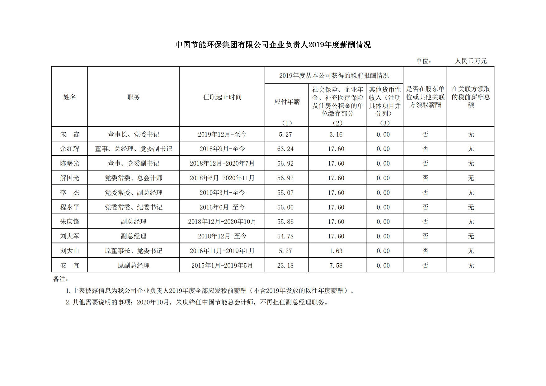中國節能環保集團公司企業負責人2019年度薪酬情況